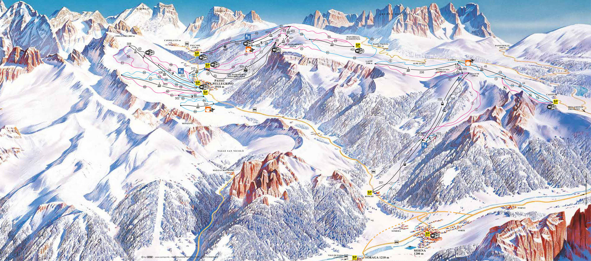 Kompleks narciarski składający się z trzech dolin: San Pellegrino Pass, Moena – Alpe de Lusia i Falcade, to jeden z najlepszych ośrodków narciarskich w Dolomitach i we Włoszech. Usytuowany w dwóch regionach w Veneto i w Trentino, ośrodek narciarski Tre Valli, niejednokrotnie zdobywał pierwsze miejsce w rankingu najlepszych terenów narciarskich we Włoszech. Około 100 do 120 km świetnie przygotowanych tras, nowoczesne wyciągi, malownicze bardzo różnorodne i atrakcyjne trasy, przepiękne widoki i 3 Topowe europejskie trasy to wizytówka Tre Valli. Trasy znajdują się na wysokościach od 1000 do 2800 n.p.m; 95% naśnieżania, ładne i nowe schroniska, nowoczesne wyciągi to charakterystyka kompleksu narciarskiego Trevalli. Najpiękniejszym szczytem jest majestatyczna i malownicza Col Margherita (2513 n.p.m) zwana „tarasem Dolomitów”. Ośrodek narciarski Tre Valli należy do grupy Dolomitisuperski. Na Tre Valli obowiązuje skipass lokalny lub Dolomitisuperski. |